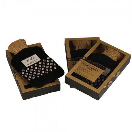 Bouillotte en caoutchouc naturel housse 3 assortis « Chauffe Marcel » / « Chaud bouillotte » / » Même pas froid » en acrylique bleu marine, capacité 2L