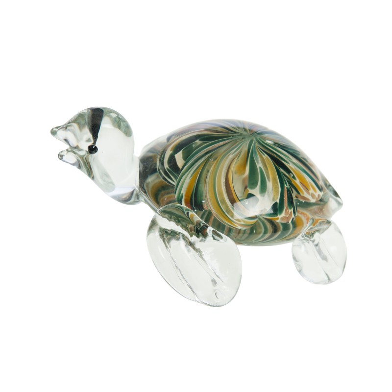 Figurine décorative en verre soufflé, représentant une tortue aux motifs colorés intégrés. Compacte (15x15x6 cm) et légère, elle s'intègre facilement dans une gamme d'objets d'art ou de décoration haut de gamme. Produit signé Amadeus, idéal pour enrichir une offre diversifiée avec une pièce artisanale et raffinée, valorisant la transparence et les effets visuels du verre.