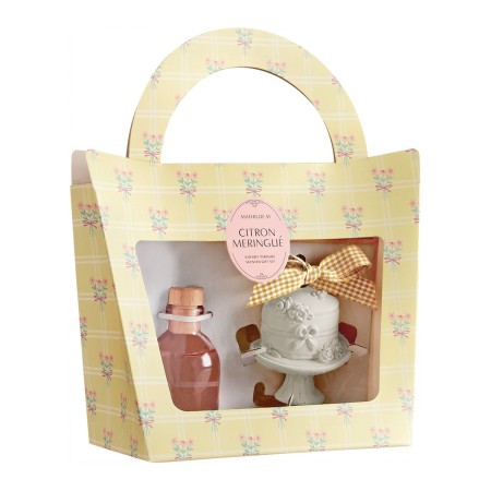 Ce coffret associe un diffuseur de parfum d’ambiance et un décor en plâtre parfumé pour créer une atmosphère délicate et gourmande. Le diffuseur parfume en continu tandis que le décor se glisse dans une armoire ou un tiroir.