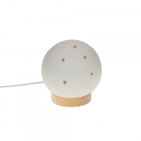 Lampe en porcelaine blanche à motifs d'étoiles découpées, montée sur un socle en bois clair. Compacte (16 cm de diamètre), elle s'intègre facilement dans une gamme de veilleuses ou lampes décoratives. Son design épuré et son éclairage doux séduisent pour une ambiance chaleureuse et apaisante.