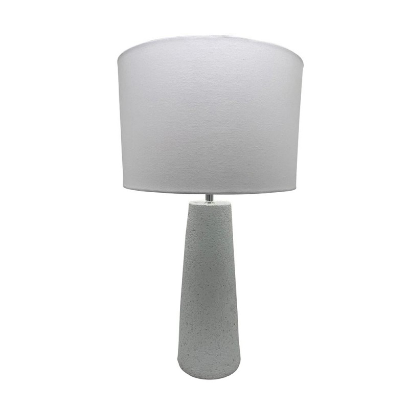 Lampe base en céramique blanche forme cônique, aspect granuleux, abat-jour lin blanc