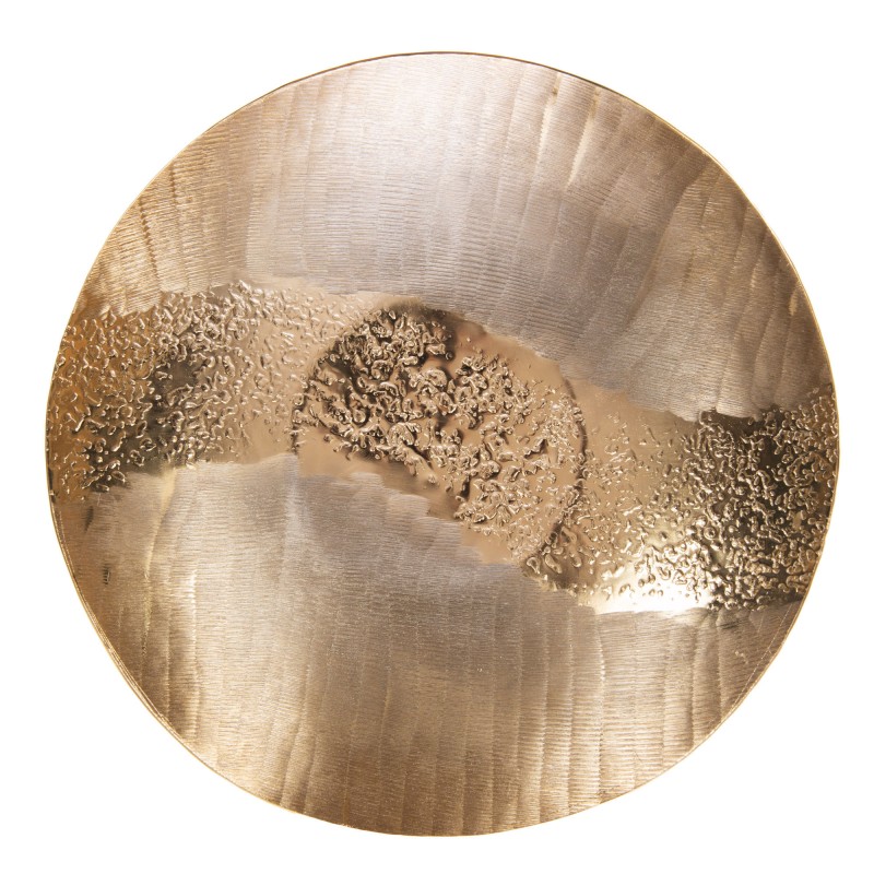Vide-poche rond en aluminium doré, diamètre 33 cm, alliant légèreté et robustesse. Sa finition texturée et brillante apporte une touche élégante et contemporaine à toute gamme d'accessoires décoratifs.