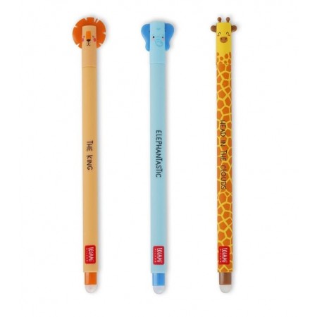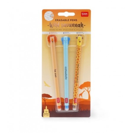 Préparez-vous à toutes les erreurs avec le Set de 3 stylos à encre gel effaçable Sous la mer : Tortue, Poisson-clown et Hippocampe de Legami, avec de l'encre turquoise, noire ou violette ou le Set de 3 stylos à encre gel effaçable Wild Savannah : lion, éléphant et girafe de Legami, avec de l'encre orange, bleue ou noire. Écrivez, effacez et gribouillez autant que vous voulez : grâce à l'encre thermosensible vous n'avez pas besoin de jeter la feuille entière, les arbres vous remercient !