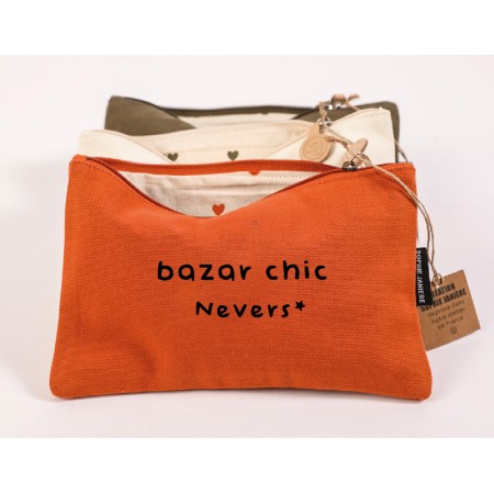 Trousse en coton avec fermeture éclair et doublure cœurs. Un petit compartiment pour tous vos objets du quotidien, idéal pour partir en week-end.